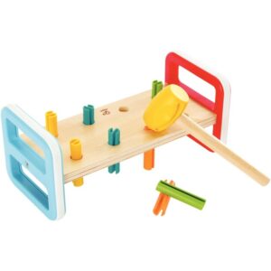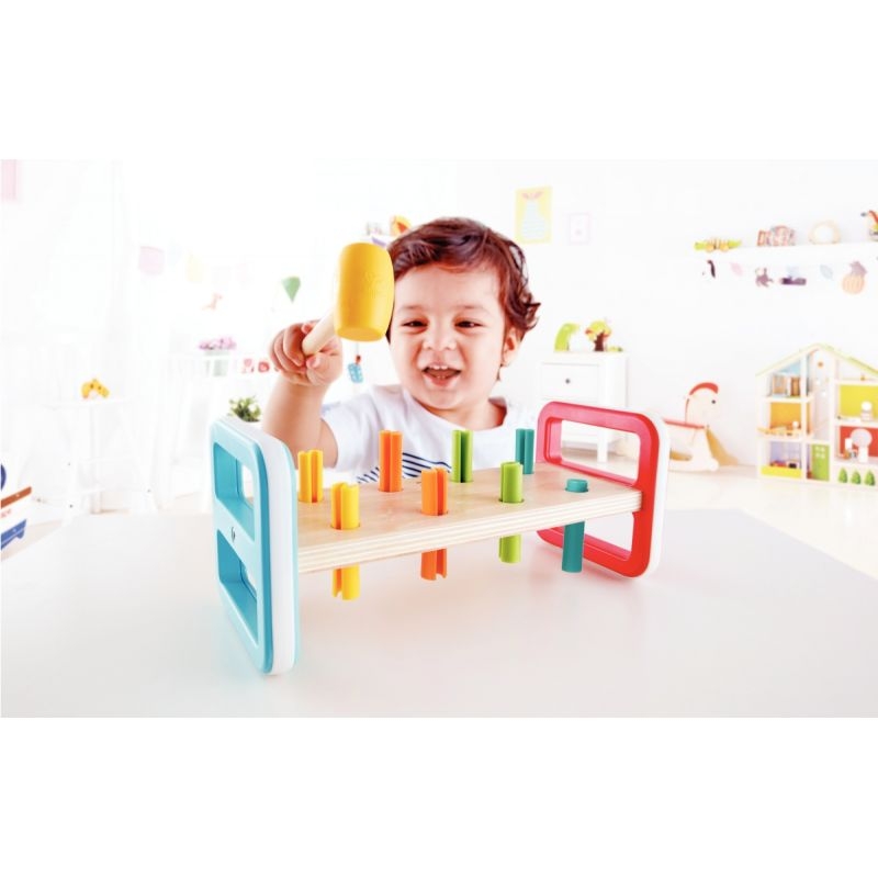 L’enfant enfonce les 8 chevilles en plastique coloré en tapant avec le maillet. utilisable recto/verso. Développe la coordination œil/main, l’habilité manuelle et offre une première approche des couleurs à associer par paire.