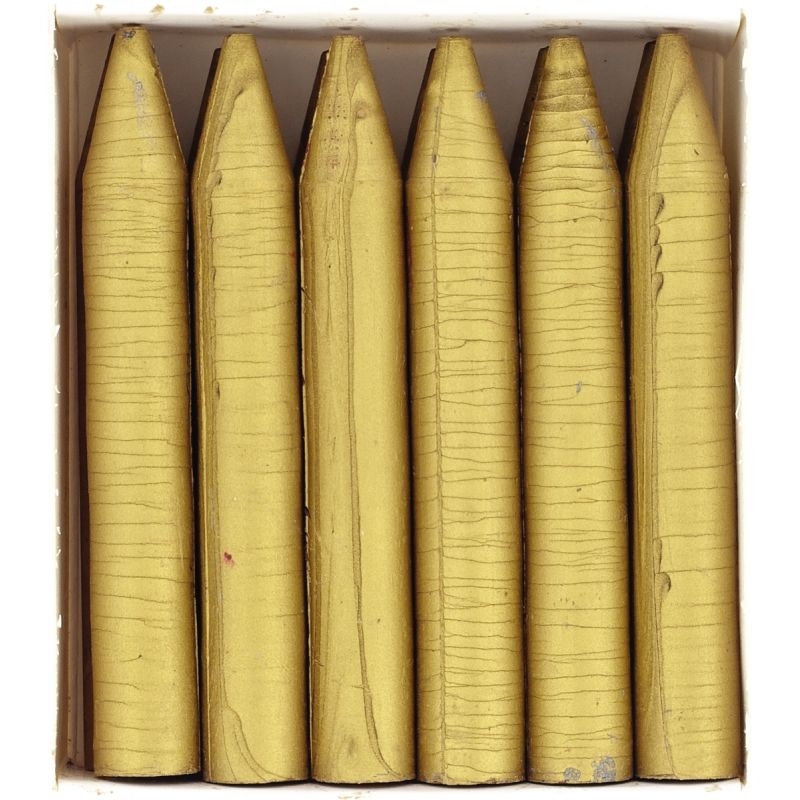 Boîte de 12 craies cire or. Pastels métallisés à la cire de qualité supérieure. Résistants aux bris Dim : 12 x 80 mm. Excellents résultats sur papier de couleurs sombres. Utilisables par les plus jeunes sans risque, ces pastels permettent l’utilisation des couleurs or avec un produit totalement inoffensif. Ces pastels permettent notamment de reproduire des pièces de monnaie par frottement. Couleur or