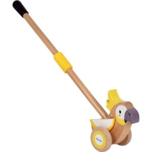 Joli perroquet en bois verni et coloré qui bat des ailes en avançant. Une légère poussée ou traction encourage l’enfant à se déplacer.