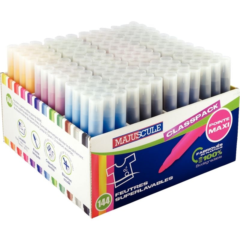 Classpack de 144 maxi feutres pointe large couleurs assorties. Feutres Majuscule, encre lavable, capuchon ventilé.