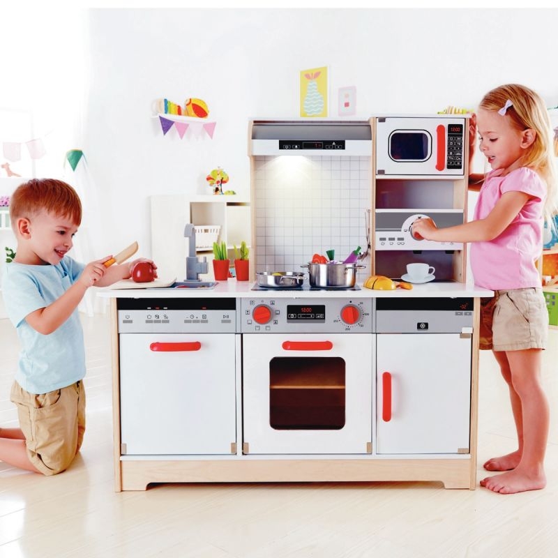 Livrée avec 4 dînettes en métal : 1 casserole, 1 poêle, 1 spatule et 1 louche. Le micro-ondes est équipé d’une sonnerie et la hotte d’une lampe. Avec un tableau noir sur le côté.