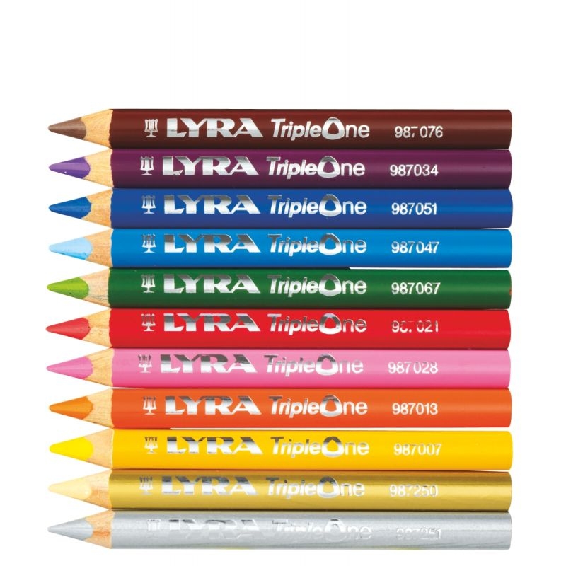 Etui carton de 12 crayons Triple One 6,25mm assorties. Crayon triangulaire à mine de 6.25mm. 3crayons en 1 Crayons de couleur à mine aquarellable et utilisation craie à la cire.Pouvoir couvrant exceptionnel. Les couleurs sont miscibles entre elles et diluables à l’eau.Grosse mine résistante au bris et hautement pigmentée.longueur 12cm avec diamètre de 10mm