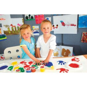 Lot de 10 pots de 225 ml de gouache aux doigts TACTIL’COLOR. Couleurs assorties : blanc, bleu, rouge, jaune, noir, rose, sienne, vert, or et argent. Pâte onctueuse épaisse et sans odeur prête à l’emploi. La présence d’un agent d’amertume permet de prévenir l’ingestion. Les couleurs sont miscibles entre elles et ont un pouvoir couvrant élevé. Les pots sont livrés dans un socle en plastique. Nettoyage à l’eau savonneuse.