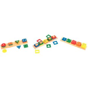 3 abaques en bois verni équipées de tiges. L’enfant doit reconnaitre les formes, les compter avant de les empiler sur les tiges selon le nombre de trous.