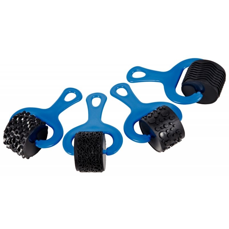 Lot de 4 rouleaux pour peinture et pâte à modeler, bleu. 4 empreintes assorties. Excellente préhension et grande facilité d’application pour les tout-petits ! Largeur du rouleau : 40 mm.