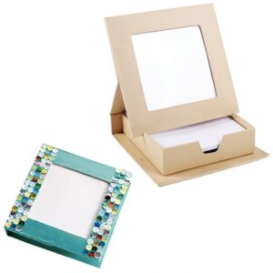Lot de 5 porte bloc-notes + photo. En carton. Fonction 2 en 1 : porte bloc-notes rechargeable et porte photo sur le dessus (photo 6×6 cm). Livré avec 80 feuilles blanches env. (9x8cm). A décorer avec des feutres, de la peinture, des paillettes, du papier décopatch… Dimensions totales du porte bloc-notes: L. 10 x l. 10 x H. 3 cm.