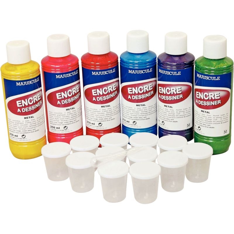 Lot de 6 flacons 250ml d’encre à dessiner métallique MAJUSCULE + 12 pots gradués 30ml offerts.