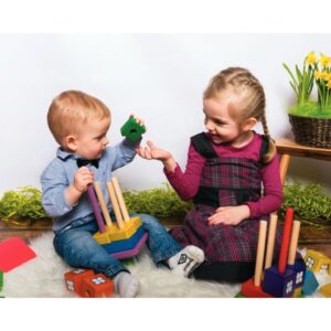 Jeu en bois massif aux couleurs très vives composé d’un socle avec 4 tiges sur lesquelles l’enfant doit empiler les 15 blocs géométriques (8 cubes fenêtres + 6 briques rectangulaires et le toit triangulaire) pour reconstituer la maison.