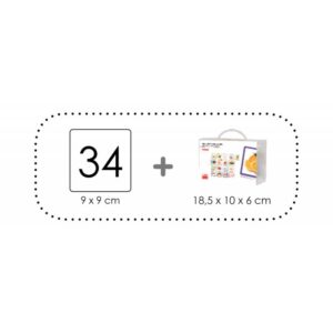 Contenu : 34 cartes en carton épais 9x9cm, livré dans une valisette en carton.