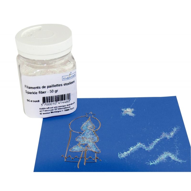 Pot salière 50 grammes de filaments de paillettes nacrés irisés. Haute brillance. Effet neige. Pour donner encore plus d’effets de brillance à vos décorations.