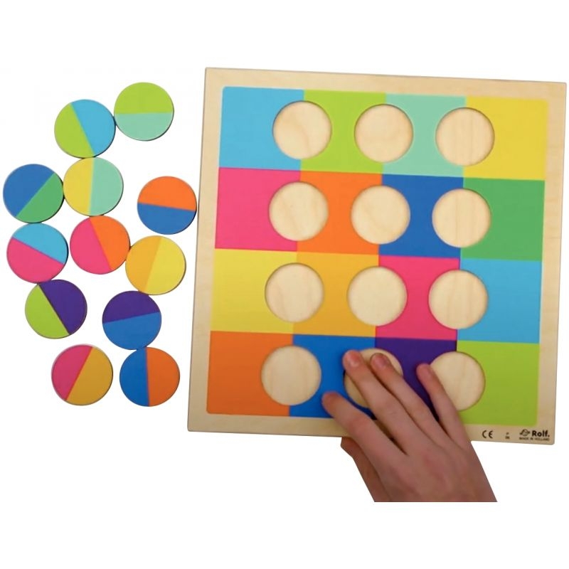 Puzzle cercle arc-en-ciel 12 pièces. En bois, 12 cercles à replacer en fonction de la couleur du plateau. Dimensions du plateau : 24.5×24.5cm A partir de 3 ans.