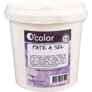 Seau 1 kg de pâte à sel. 3 volumes pour 1 volume d’eau. Mélanger pour obtenir une pâte homogène. Laisser reposer 30 à 45 minutes. Cuisson au four ménager pendant environ 2 heures. Conservation du surplus de pâte au réfrigérateur pendant 2 semaines. Après cuisson, la pâte à sel peut être peinte avec de la gouache, de l’acrylique puis vernis.