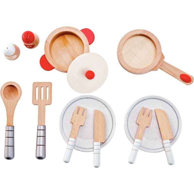 13 pièces en bois brut et coloré : 1 casserole avec un couvercle, 1 poêle (L.19 cm), 2 assiettes (Ø.13 cm), 2 fourchettes, 2 couteaux (L.13 cm), 1 louche, 1 spatule, 1 salière et 1 poivrière (H.6 cm).